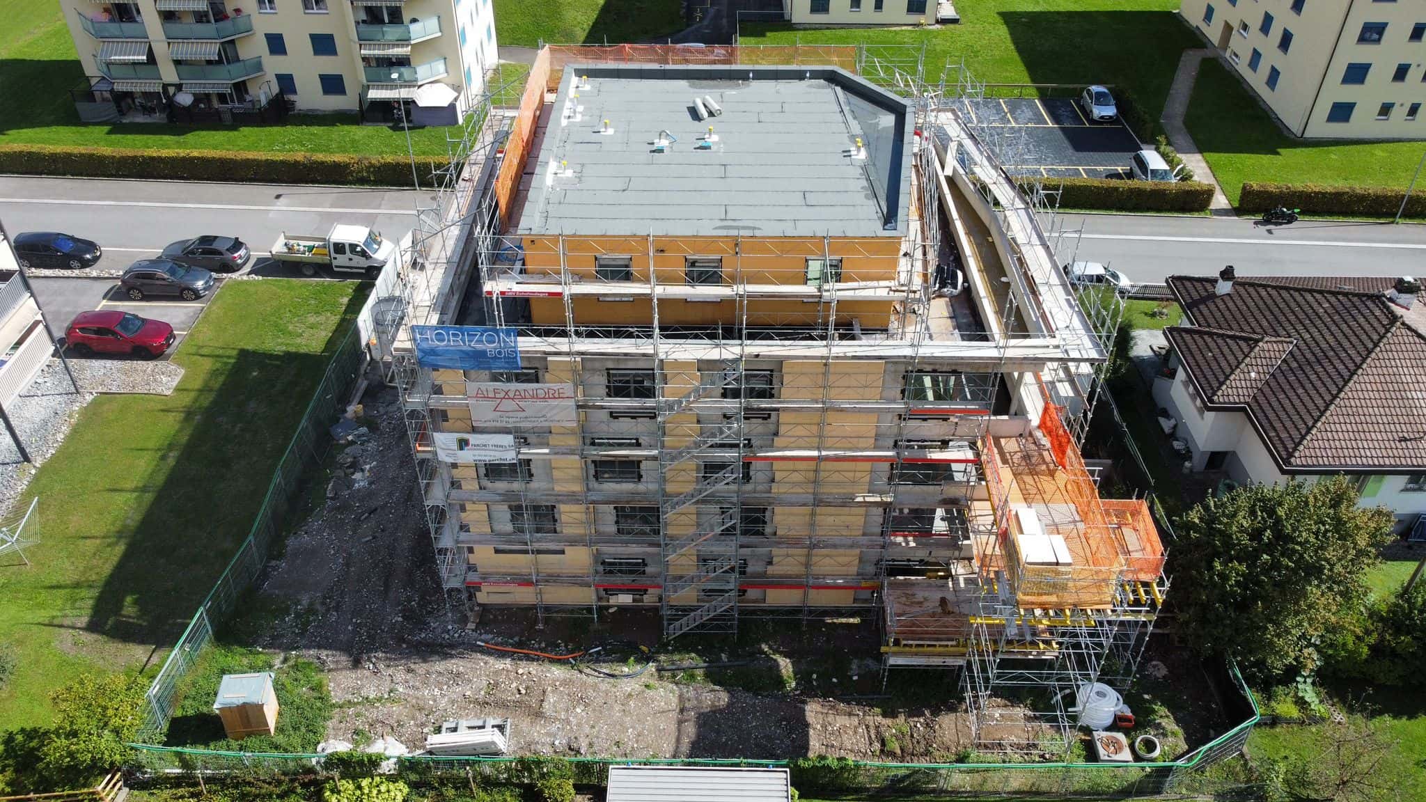 Après la démolition et la phase de gros-œuvre, le chantier entre désormais dans la phase finale des travaux. Le projet prend forme et révèle peu à peu toute son harmonie dans le paysage, entre montagnes et sérénité valaisanne.